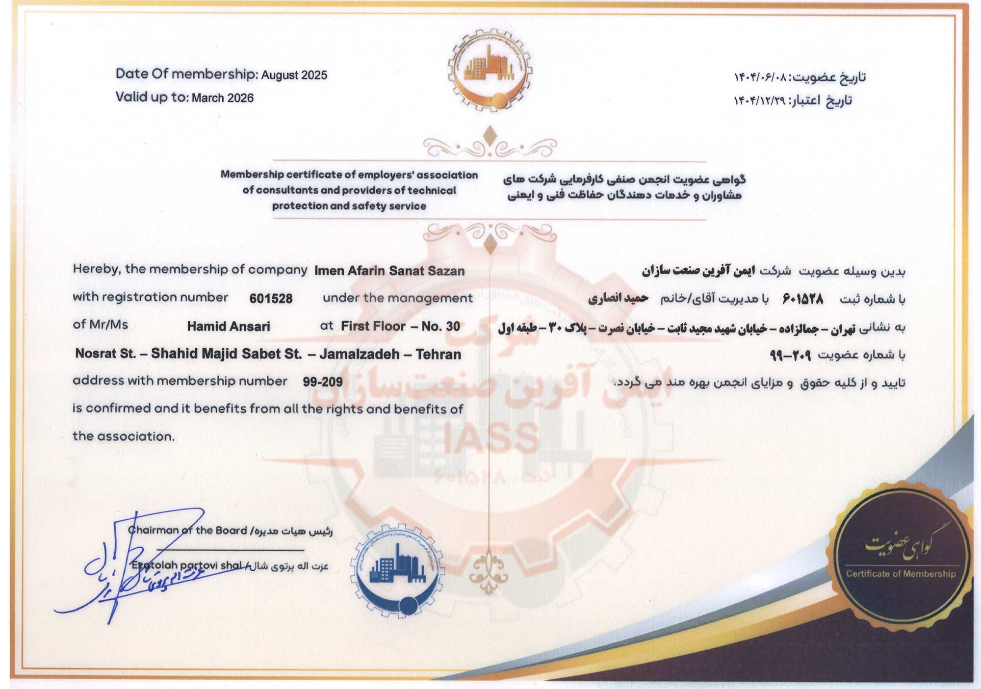 گواهی عضویت انجمن صنفی کارفرمایی شرکت های مشاوران و خدمات دهندگان حفاظت فنی و ایمنی